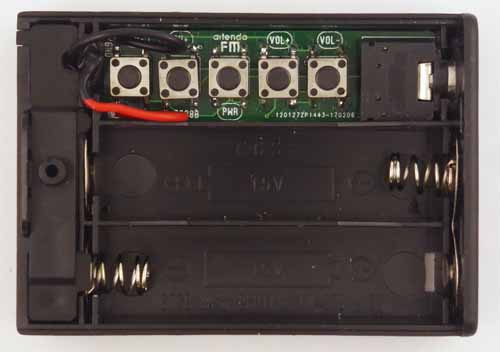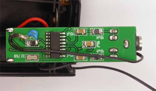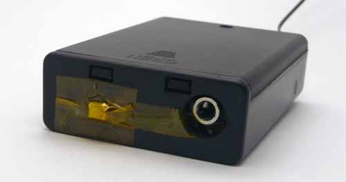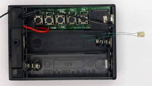 製 作 例 電池ボックスのフタを開けてタクトスイッチの操作をすることにしました。 そのため、タクトスイッチのボタンを電池ボックスの外側からアクセスできるようにはしませんでした。 ただし、イヤフォンジャックにイヤフォンを差し込むために丸穴を1ヶ所あけました。
