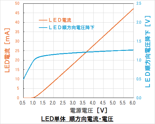 電源電圧を横軸にしてグラフ化しています。 【 LED単体 電流電圧特性 】
