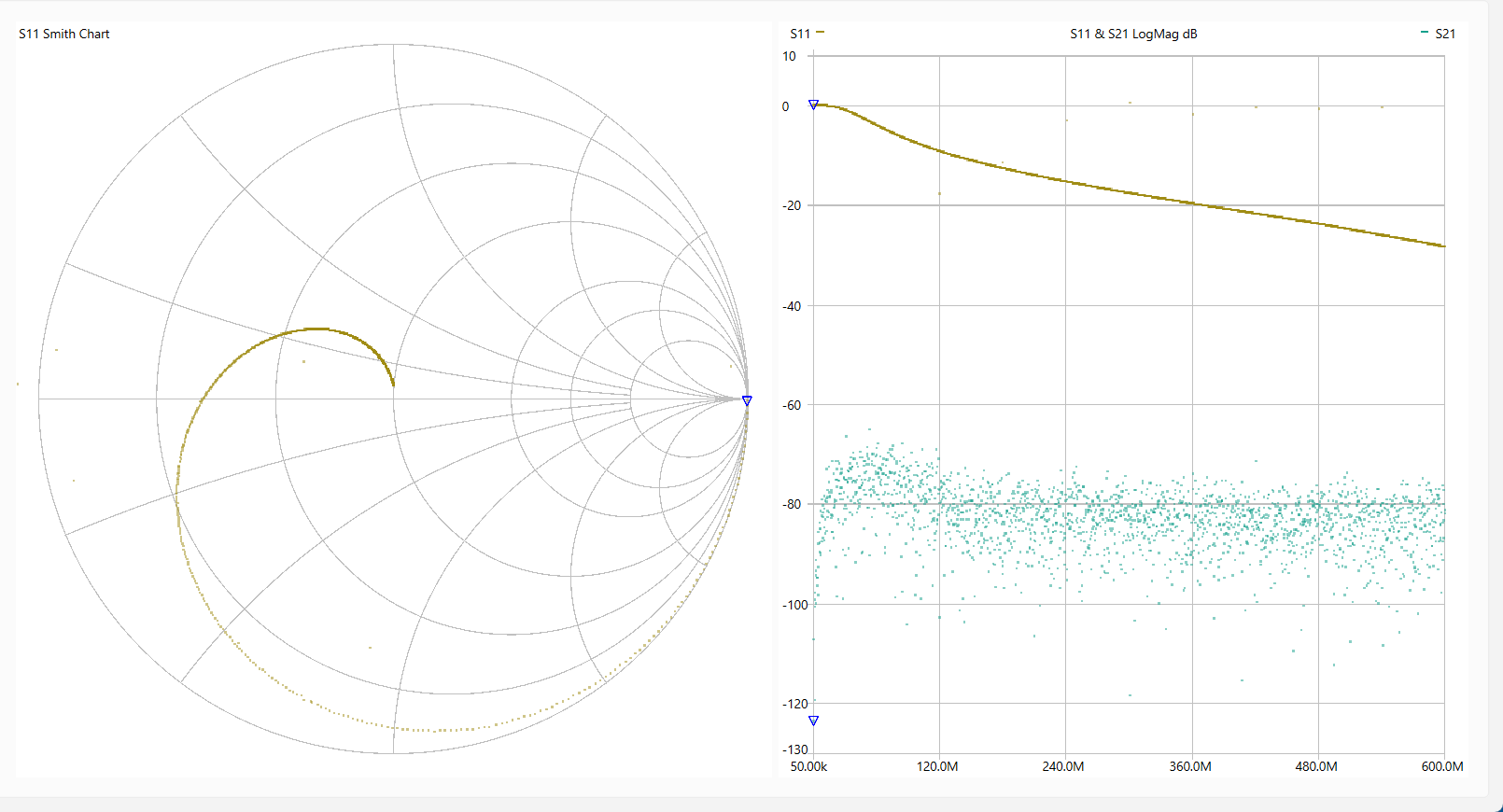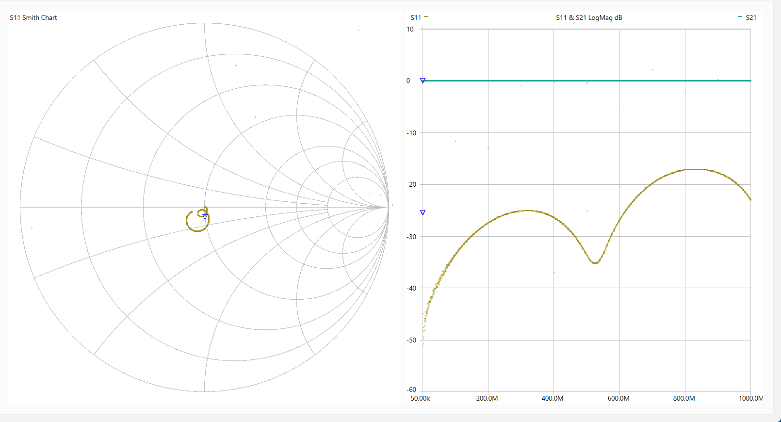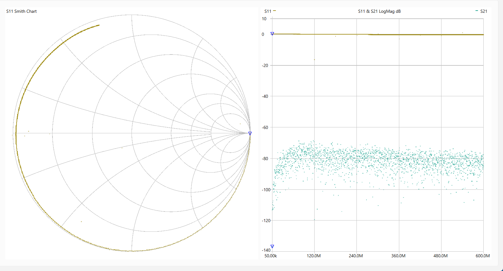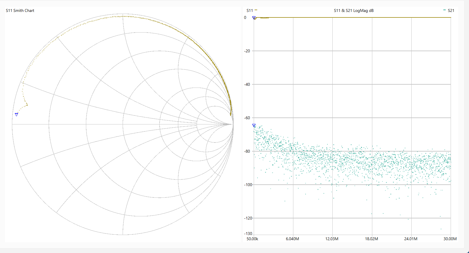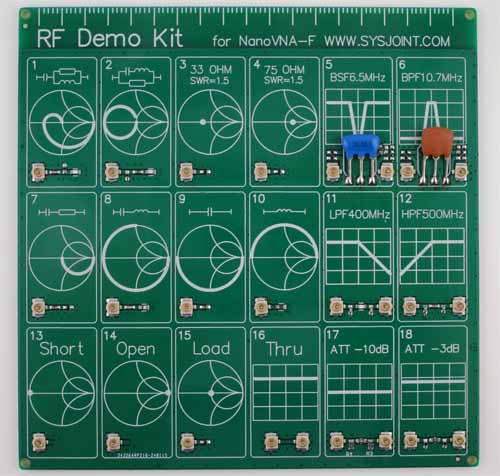 動 作 確 認 「LiteVNA64」を使って各回路を測定しました。 使用ソフトは[NanoVNASaver:0.7.3」を利用し、Segments=10(周波数スパンを10分割して連続スキャン。 今回は最大でも約1MHzステップで測定。)としました。 なお、肝心のキャリブレーションは とても不本意ではありますが本基板のCircuit13(Sort)、Circuit14(Open)、Circuit15(Load)、Circuit16(Through)を利用しました。