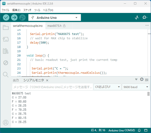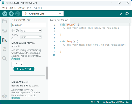 MAX6675 library by Adafruitをインストールしました。 【 ライブラリ選択 】