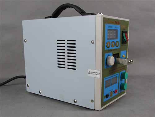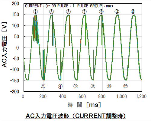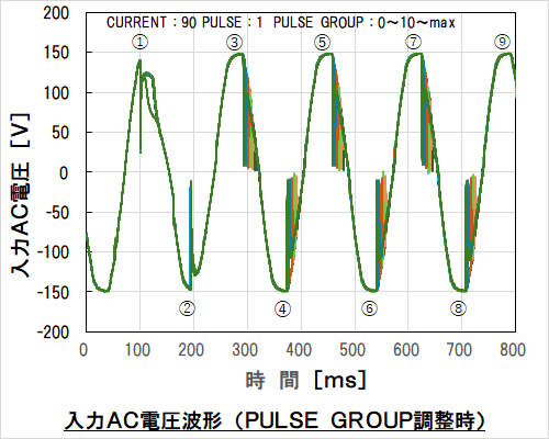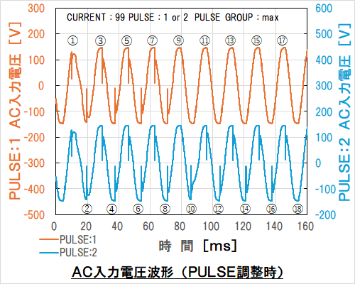 どちらの方法が適切なのかわかりません。 とりあえずその場に応じて適当に溶接する事にしました。 お遊びだからできることです。 実際にスポット溶接をする場合、CURRENT・PULSE・PULSE GROUPの3ヶ所の調整・設定をします。 取扱い説明書を読んでも理解できませんでした。 多分位相制御をしているであろうと推測してACラインの位相制御時のターンオン時電圧波形を観測することにしました。 その際、ACラインの電流波形も観測するために電流測定用抵抗1Ωを挿入しています。 位相制御時のターンオン時の突入電流によりACラインの電圧が大きく低下して、実際のスポット溶接時の電圧・電流波形とは異なる結果となります。 今回は制御方法の確認ということで位相制御方法の確認を優先しましたので、 電圧低下にはこだわらないようにしました。 その結果を下記に掲載します。
