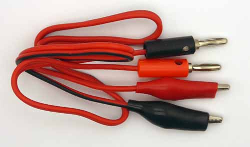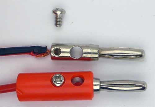 バナナプラグの電線はカバー取付けネジで素線を押さえ付けて接続していました。 【 アクセサリA 充電用電源・電圧計テスタ用電線外観1 】