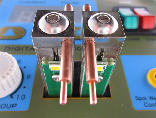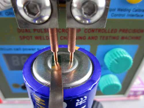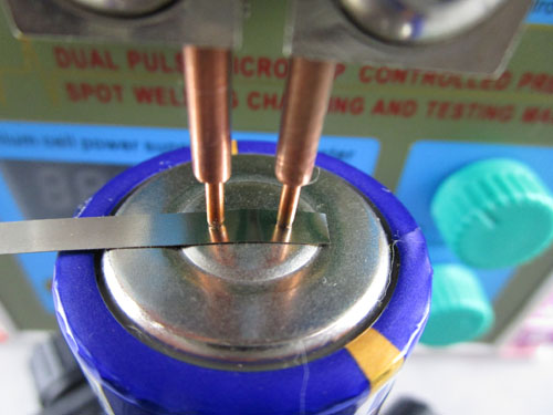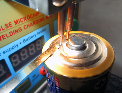 他の方法として、溶接棒の1本は溶接する金属板、もう1本は被溶接金属(下記画像では電池のマイナス側金属)に接触する方法もあると思います。