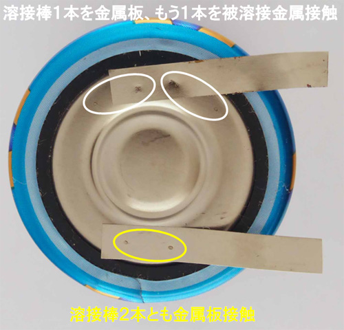 【 溶接棒1本を金属板、もう1本を被溶接金属接触時(接触例) 】