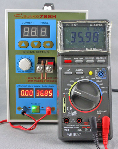 M−3870の電圧測定表示は35.98Vでした。 【 電圧出力時(最大出力電圧36.85V設定時) 】