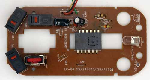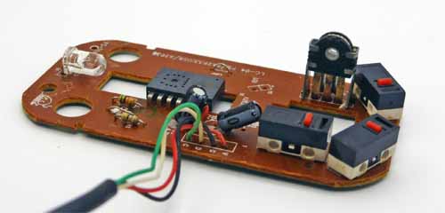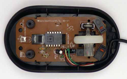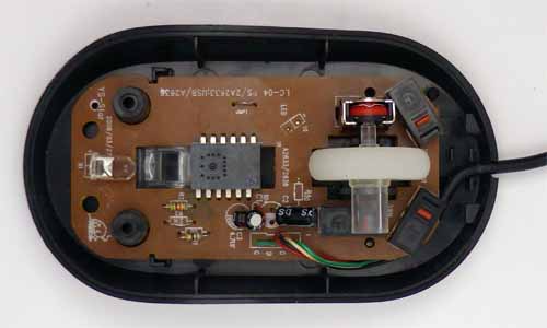 マウス内部の外観を下図に示します。 外観上に異常は見受けられません。 マイクロスイッチに隣接したマウスホイール用エンコーダが見つかりました。