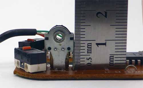 ネット上でマウスホイール用エンコーダを調べると、基板表面から軸中心までの高さにいくつもの種類があるようでした。 今回は簡易測定で11mmと判断しました。 この測定結果から交換用エンコーダを選定・購入することにしました。