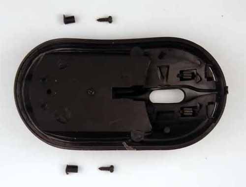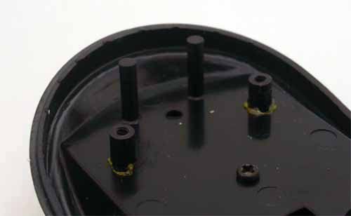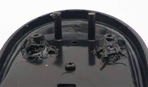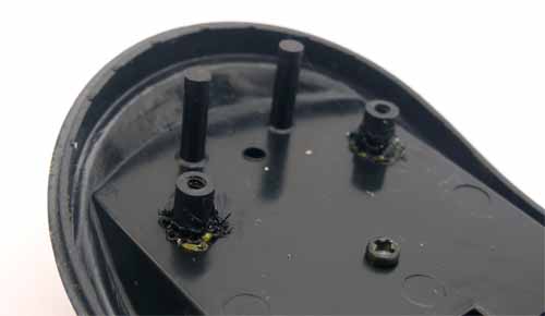 今回は最初からつまづき、マウスの分解に失敗しました。 マウス上部がはめ込み式と勝手に思い込み、ねじ止め穴有無の確認をせずにマウス上部を無理やり力ずくで外しました。 ペキッという音とともにマウス上部が外れましたが・・・・。 ねじ止め支柱が折れていました。 マウス底面にあるネジ用穴はシールで隠される事なく堂々と存在を誇示しています。 にも関わらずやってしまいました。 これで破損箇所が増えてしまいました。