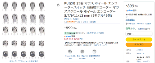 部品入手に苦労する田舎に住んでいたDNAに起因したいつもの悪い癖がでました。 今回の修理では11mmのエンコーダを購入しましたが、他にもいろいろな高さのエンコーダがありました。 その中で高さ5種類・各5個合計25個で899円の商品がありました。 1個当たり40円以下です。 これは安いとの第一印象を持ち、この価格ならば使う予定が無くても今後の補修用にいいかもと思っていた矢先、不思議なことにいつの間にかカートに入っていました。 そのうえ、修理品用エンコーダに加えてこの商品も誤って同時注文していました。