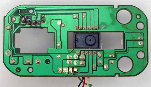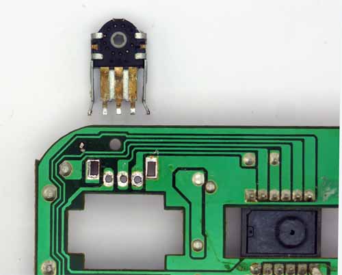 プリント基板を取出しました。 マウスホイール用エンコーダ自体の表面が酸化しているようですが、それ以外に異常と思われるところはありませんでした。