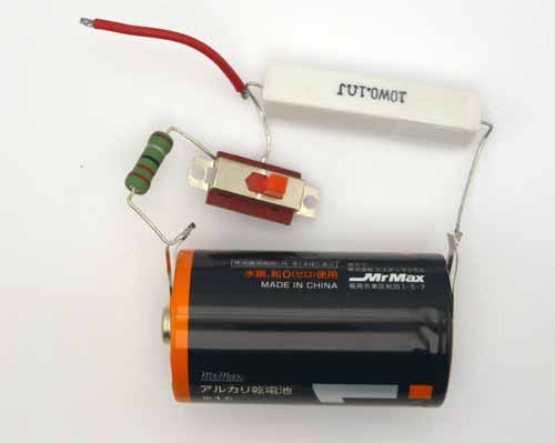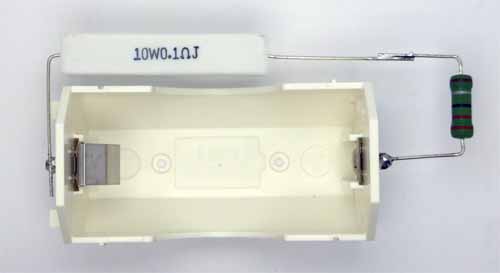 過去に「ラジオ電池駆動時間が短い? 単4形乾電池持ち時間を調べようの巻」で電池ボックスを利用して測定していました。 この経験から今回も「単1電池ボックス(1本用) Item No:70148」を利用して測定を開始しました。 その際の測定回路を下記に掲載します。 負荷としては主負荷として抵抗2.2Ω、電流測定用10Wセメント抵抗0.1Ωのみで電池ボックスの取出し端子に直接ハンダ付けしました。 乾電池オンオフスイッチは設けず、乾電池の脱着でオンオフとしていました。