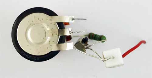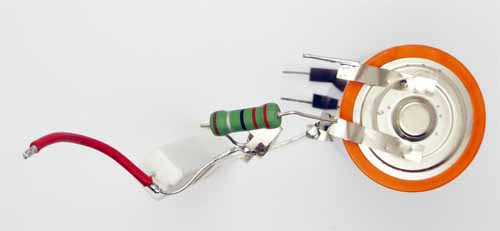 上側の赤い電線は電流検出+側引出し用です。 電流校正時には赤い電線接続部位からスライドスイッチまでの間のリード線に電流校正用電源の+側を接続します。 |