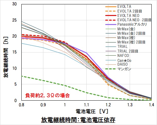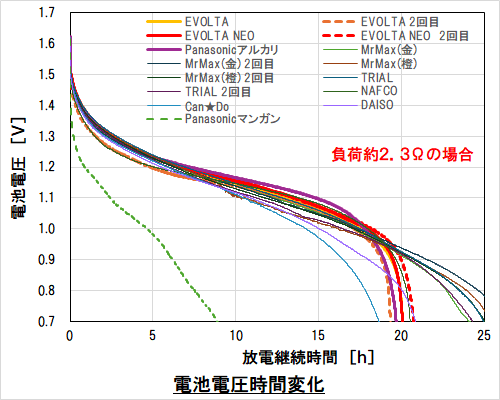 最初に基本的な結果として電池電圧の時間変化(放電継続時間と記載)を比較しました。 アルカリ乾電池に関しては放電初期は同じような変化をしていますが、18時間を超える頃からPanasonic製乾電池(EVOLTA、EVOLTA NEO、Panasonic アルカリ乾電池)は急激に電圧低下が生じています。 多少のぱらつきはありますがPanasonic製乾電池(EVOLTA、EVOLTA NEO、Panasonic アルカリ乾電池)の変化は似たような様をしており、かつ、他のアルカリ乾電池とは異なる挙動を示してました。 表現は適切ではないですが、同じような製品をブランド名を変えて販売していると言ってもおかしくないような変化でした。