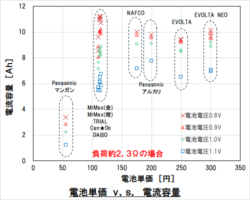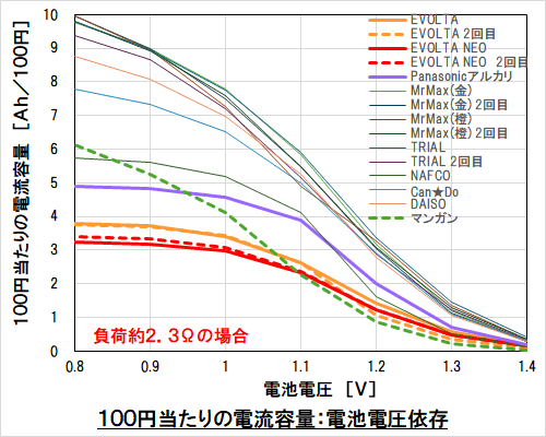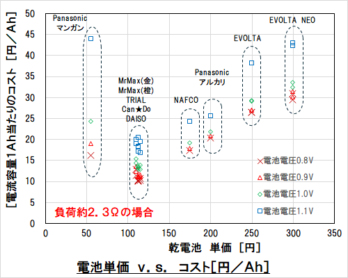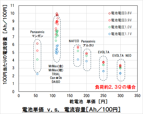 これ以降、コストパフォーマンス関係をグラフ化しました。 下記は縦軸に電池1本当たりの購入価格100円に対する電流容量[Ah]]を、横軸に電池電圧としてグラフ化してみました。 電池電圧1V以下では、購入価格の高い EVOLTA、および、EVOLTA NEOの電流容量が低いのが目立ちます。 逆に、マンガン乾電池は購入価格が安価なため数字としては電流容量は高くなっていますが、電圧を維持する能力が低いため短時間しか利用できないことを忘れてはいけません。
