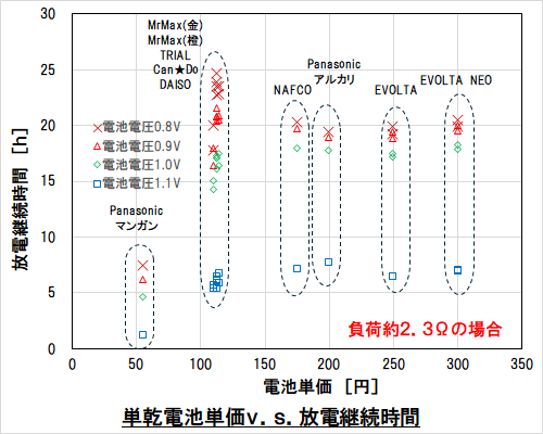 を使用しました。 アルカリ乾電池1個当たりの価格は最低でも110円します。 もう二度と単1型乾電池の測定はしたくありません。