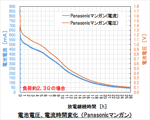 なお、マンガン乾電池は電源オン初期から電池電圧低下は大きくなっています。
